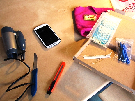 stumpfes Messer, Fön, Handy Glas Reparaturset (also Ersatzglas und Klebefolie), Glasreiniger, doppelseitiges Klebeband.