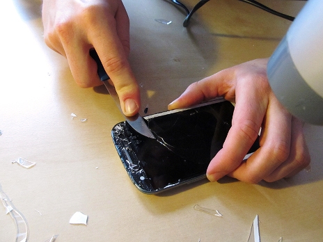 4. Mit dem stumpfen Messer ganz vorsichtig (nicht das eigentliche Display beschädigen) unter die Glasteile gehen und nach und nach „abschaben“, dabei immer wieder mit dem Fön erhitzen (deswegen am besten zu zweit machen)