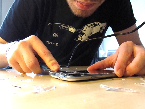 10. Klebefolie passgenau auf das Handy kleben und Schutzfolie abziehen