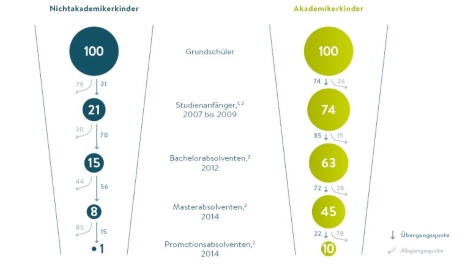 Soziale Selektion setzt schon in der Schule ein: Eine Hochschulzugangsberechtigung erwerben nur etwa halb so viele Nicht-Akademiker Kinder wie Akademiker-Kinder. Doch die soziale Selektion steigert sich mit den akademischen Schwellen: während von 100 Nicht-Akademikern 21 ein Hochschulstudium beginnen, sind es bei 100 Akademiker-Kindern 74 (Verhältnis 1:3,5). Beim Bachelorabschluss bleibt das Verhältnis in etwa gleich (1:4), wohingegen die soziale Selektion sich zum Master noch einmal verschärft: hier beginnen von 100 Nicht-Akademiker-Kindern 8 ein Masterstudium, und von 100 Akademiker-Kindern immerhin 45. Hier ist das Verhältnis 1:6, und bei der Promotion verläuft sich das Verhältnis sogar auf 1:10. Von 100 Nicht-Akademiker-Kindern promoviert also durchschnittlich einer, während bei 100 Nicht-Akademiker-Kindern circa 10 einen Doktortitel erwerben.