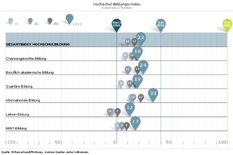 Grundlage für den jährlichen Hochschul-Bildungs-Report 2020 ist die Betrachtung und Bewertung von sechs Handlungsfeldern im Bezug auf die Hochschulbildung, nämlich: Chancengerechte Bildung, Beruflich-akademische Bildung, Quartäre Bildung, Internationale Bildung, Lehrer-Bildung und MINT-Bildung. Für jedes Handlungsfeld wurden Ziele formuliert und 71 Indikatoren herausgebildet.Außerdem werden noch drei Zieldimensionen zum Vergleich herangezogen, nämlich Akademikerbedarf, Diversität und Nachfrageorientierung. Im Jahr 2010 startete die Untersuchung bei 0 Indexpunkten. Wenn alle Indikatoren die gesetzten Ziele erreichen, so müsste der Indexwert 2020 bei 100 liegen, und 2015 bei 50. Diesen Wert verfehlt der Hochschul-Bildungs-Index deutlich. Keines der sechs Handlungsfelder und keine der 3 Zieldimensionen erreicht die Marke von 50 Punkten und die damit gesetzten Ziele, wie in der Grafik ersichtlich ist: