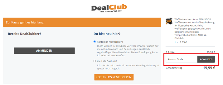 Es gibt bei Dealclub zwei Arten von Gutscheinen. Bei den einen wird kein Code benötigt und der reduziert Preis wird automatisch angezeigt. Bei den anderen erhältst du einen Dealcode auf ein bestimmtes Produkt. Lege den Artikel in den Warenkorb. Dort findest du das Feld "Promo Code". Gib dort deinen Code ein, klicke auf "Anwenden", und schon wird der Rabatt automatisch vom Gesamtbetrag abgezogen. Nun kannst du wie gewohnt deine vergünstigte Bestellung abschließen.