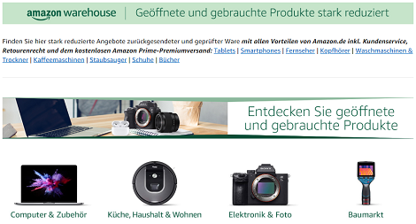 Suchst du nach noch mehr Schnäppchen, solltest du dich bei den Amazon Warehousedeals umsehen. Hier findest du Produkte aus allen Sortimenten, welche bereits geöffnet wurden und wieder zurückgeschickt wurden oder gebraucht sind. Diese sind in Top-Qualität, aber durch die Retoure stark reduziert - bis zu 75% Ermäßigung kannst du hier erhalten! Hiermit kannst du nicht nur bares Geld sparen, sondern tust auch der Umwelt etwas Gutes. Im Amazon Outlet findest du zudem Bekleidung, Schuhe, Uhren und Schmuck mit bis zu 70% Rabatt. Und ab und an gibt es einen 10% Amazon Rabattcode auf retournierte Ware!