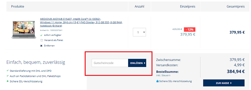 • Gib deinen Medion Gutscheincode dort ein und klicke auf "Einlösen".