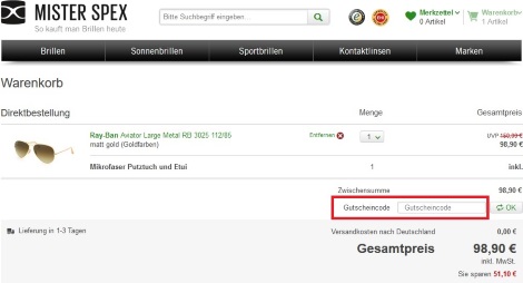 Hast du die perfekte Brille oder Sonnenbrille für dich gefunden und möchtest deine Bestellung abschließen, musst du zunächst zum Warenkorb klicken. Hier findest du direkt unter der Zwischensumme das Feld „Gutscheincode“. Den Mister Spex Gutschein musst du hier eintippen und anschließend auf „OK“ klicken, um ihn auch einzulösen. Sofort wird die neue Gesamtsumme deiner Bestellung berechnet. Sparen kann so einfach sein!