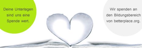 Bis zum 29. Februar 2016 spenden wir für jede hochgeladene Mitschrift, Klausur, Übungslösungen, Zusammenfassungen, Skripte, Karteikarten, Protokolle oder ähnlich nützliche Unterlagen 10 Cent an betterplace.