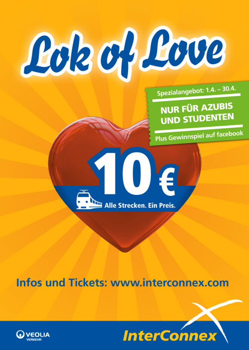 Die Frühjahrsaktion „Lok of Love“ lässt Studenten, Schüler und Azubis im April 2011 auf allen InterConnex-Verbindungen für nur 10 EUR Zug fahren.