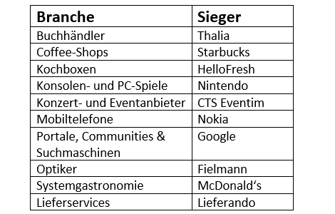 Es ergaben sich die Differenz aus positiven und negativen Nennungen im Verhältnis zur Gesamtzahl der Nennungen und die Gesamtzahl der Nennungen im Verhältnis zum jeweiligen Mittelwert der Branche. Beide Werte wurden multipliziert und ergaben den endgültigen score, des jeweiligen Unternehmens. Das beste Unternehmen (100 Punkte) und schlechteste Unternehmen (0 Punkte) der Branche bilden in der Auswertung die Eckpunkte. Alle anderen Wettbewerber wurden anhand ihrer Punktzahl entsprechend eingeordnet.