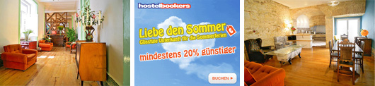 Hostelbookers.de hat vom 14. bis 31. Juli 2010 eine Sommeraktion, wo ihr zusätzlich noch mal kräftig sparen könnt. Und die Auswahl der Reiseziele ist riesengroß, denn es nehmen mehr als 200 Hostels in den 30 beliebtesten Reisezielen der Welt teil. Da sollte für jeden das Passende dabei sein - egal ob Europa oder Übersee. Der Aufenthalt muss zwischen dem 14. Juli und dem 30. September 2010 liegen, aber das passt ja super in die Semesterferien. Außerdem gelten die AGBs.
