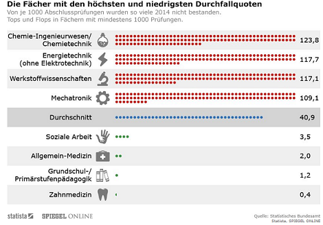 Die Infografik von Spiegel Online und Statista von 2014 zeigt, dass die höchsten Durchfallquoten eher in den technischen Fächern liegen. Der Anspruch an den Nachwuchs an Natur- und Ingenieurwissenschaftlern ist besonders hoch. Hier helfen schwere Prüfungen bei der Aussiebung.