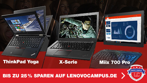 Gut, dass Notebooks und Tablets immer günstiger werden – noch besser, dass sie für Dich besonders günstig sind! Denn bei Lenovo Campus erhalten Studierende noch mal bis zu 25 % Rabatt oben drauf: auf exklusiv konfigurierte Notebooks und 2-in-Geräte der Lenovo Reihen ThinkPad, IdeaPad, ThinkBook, Yoga und Legion. Zudem auf Legion Gaming-PCs und Yoga Desktop-PCs sowie Zubehör! Das komplette Sortiment findest Du auf lenovocampus.de.